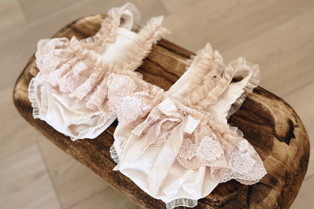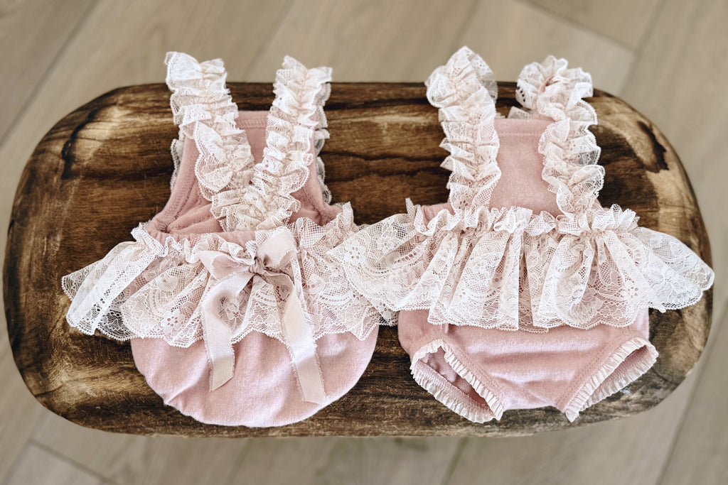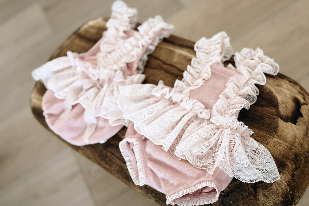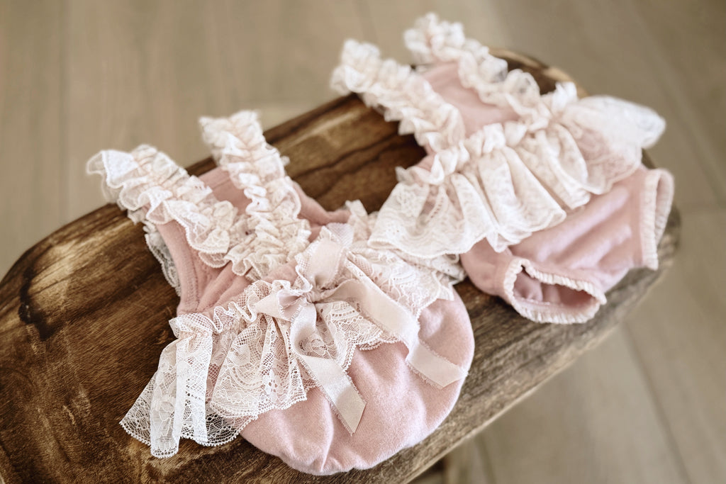 • Buttery-soft knit romper with lace ruffles